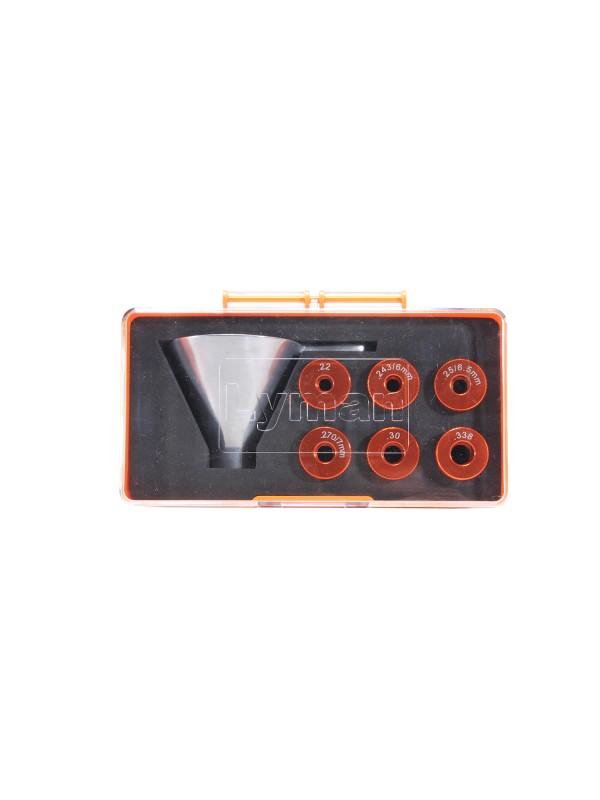 Lyman’s Precision Funnel Set is the “Perfect” system for the serious reloader. The Brass Smith Precision Funnel Set is made to be completely static free, no more powder clinging to surfaces which can happen with lightweight plastic funnels. The solid construction and quality of the Brass Smith Precision Funnel Set will be apparent in its first use. This is no “one size fits all” funnel, the Brass Smith Precision Funnel Set uses precision machined, caliber specific inserts to properly fit the case neck. The inserts can be quickly and easily installed by simply pushing them into place and then pulling them out when changing calibers. The Brass Smith Precision Funnel Set also comes with a padded storage case that neatly stores extra inserts when not in use. The funnel comes with inserts for 22, 243/6mm, 25/6.5mm, 270/7mm, 30 and 338 caliber rifle cartridges.